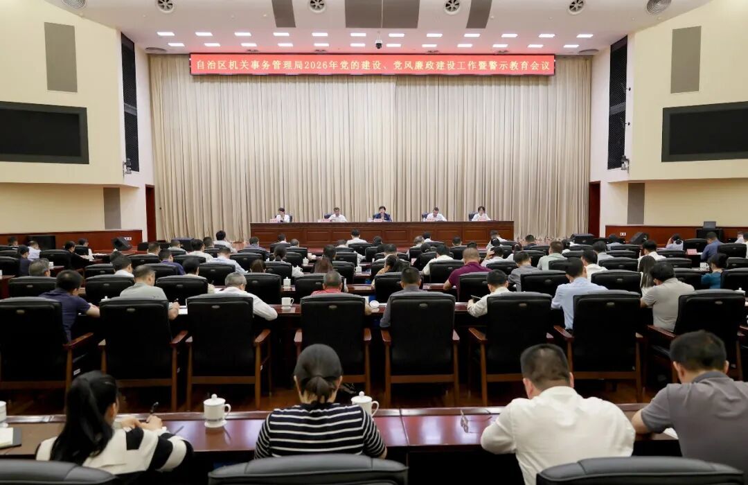 3月26日,自治区机关事务管理局召开2026年党的建设、党风廉政建设工作暨警示教育会议。自治区人民政府副秘书长、局党组书记、局长黄小川出席会议并讲话,局党组成员、副局长杨健豪主持会议,局党组成员、副局长梁万山出席会议,局党组成员、副局长、机关党委书记黄译萩作工作报告,驻局纪检监察组副组长陆伟红出席会议并讲话。